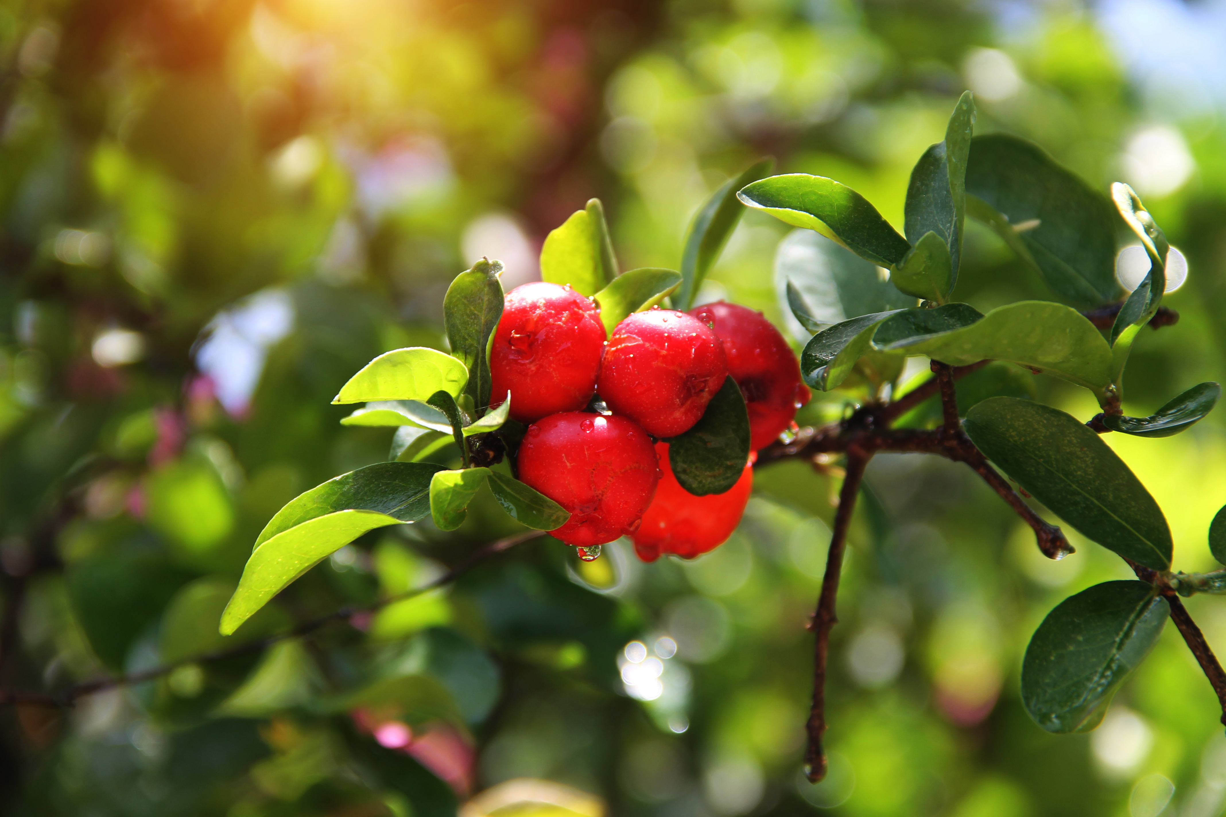 • La acerola, también conocida como cereza de Barbados, es una planta tropical con frutos de color rojo brillante que crece en América Central y del Sur.