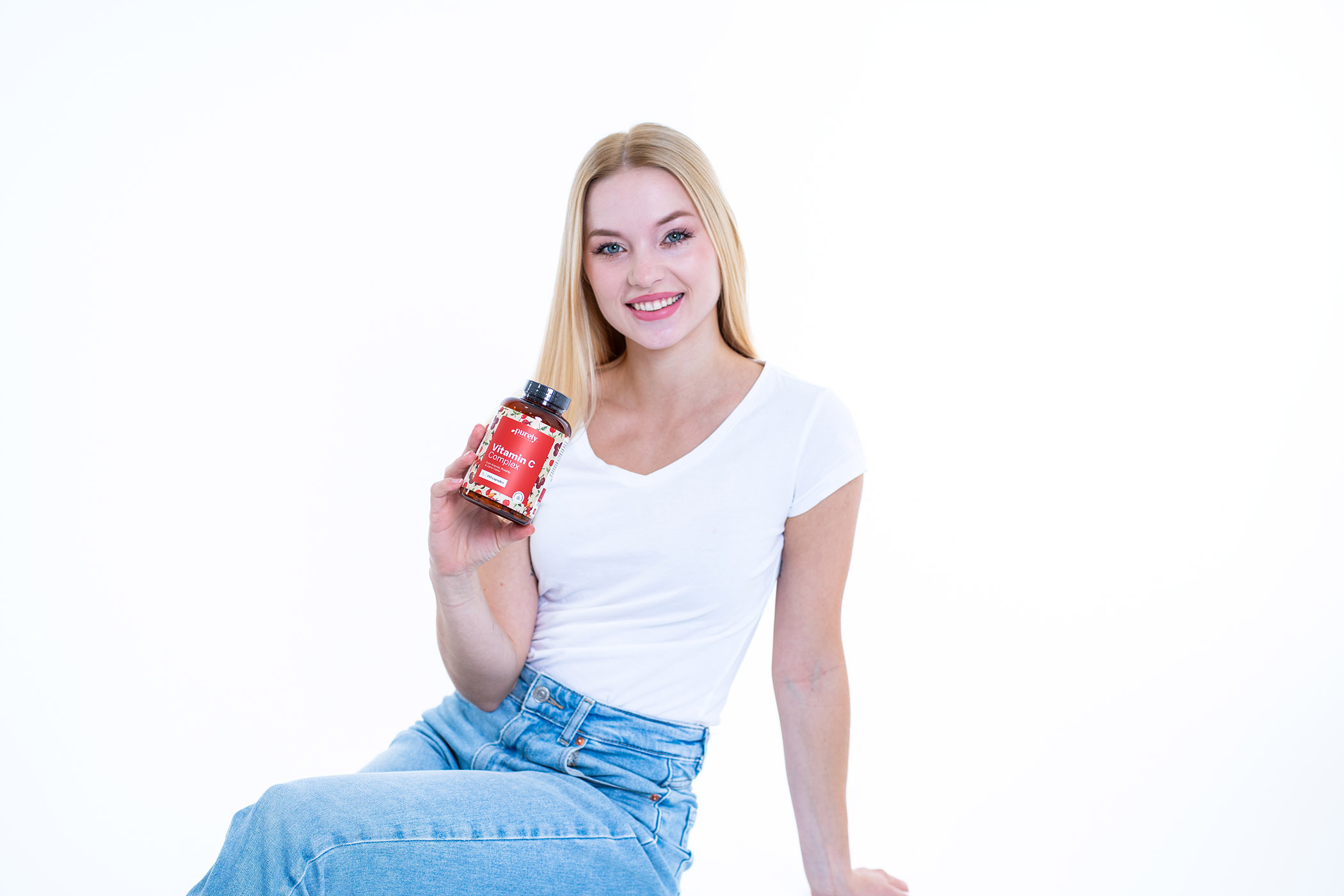 Ingredientes: L-ascorbato de calcio, extracto de frutos de acerola 15:1 (Malpighia glabra; 25 % de vitamina C), extracto de frutos de camu camu 5:1 (Myrciaria dubia; 30% de vitamina C), almidón de patata, extracto de frutos de escaramujo 20:1 (Rosa canina; 45% de vitamina C), hidroxipropilmetilcelulosa (HPMC; cápsula de origen vegetal).